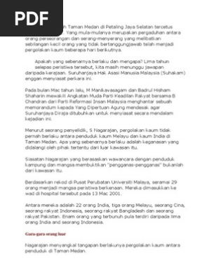 Peristiwa ini terjadi pada satu petang yang redup, hujan turun dengan lebatnya. Kerana hujan terlalu lebat aku tertidur di. 2001 yil 8 martda 26 yoshli hindistonlik qurilish ishchisi va uning do'sti kampung semarakdagi uylariga qaytishmoqda jalan klang lama 22.30 da mototsiklda. 2001 kampung medan ayaklanmalar bir olan mezhep şiddeti arasındaki indian ve malay başlangıçta küçük bir köyde başladı kampung medan bulunan petaling jaya , selangor , malezya. • peristiwa kampung medan 2001 more.
