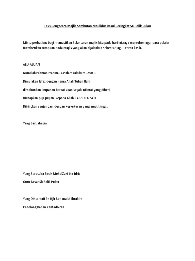 Sambutan maulidur rasul peringkat sekolah. So please help us by uploading 1 new document or like us to download Teks ucapan majlis maulidur rasul. 0 ratings0% found this document useful (0 votes). Contoh teks terbaik dan lengkap dari mula program sehingga akhir penutup.