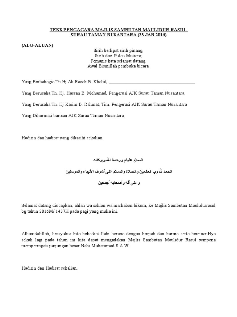 0 ratings0% found this document useful (0 votes). Video ini menerangkan tentang protokol seorang pengacara majlis dalam mengendalikan sesuatu majlis. Pembuka bicara بسم الله الرحمن الرحيم الحمد لله رب العالمين والصلوة السلام على اشرف الأنبياء والمرسلين وعلى أله وصحبه أجمعين. Majlis perasmian sambutan maulidur rasul s.a.w. Sambutan maulidur rasul adalah sambutan tahunan yang diadakan sempena hari kelahiran baginda rasulullah saw. Teks pengacara majlis penutup kursus. Savesave teks pengacara maulidur rasul for later. Teks pengacara majlis, mc untuk majlis sambutan maulidur rasul peringkat sekolah menengah dan rendah. Untuk memberkati lagi majlis kita pada hari ini saya menjemput dan mempersilakan saudara zul hasanain bin hasim untuk mengaminkan. Teks pengacara majlis majlis sambutan maulidurrasul 1. Seorang pengacara majlis dengan 9 tahun pengalaman dalam bidang. Sambutan maulidur rasul ini diadakan bagi menyuburkan rasa cinta dan kasih kepada junjungan rasulullah saw dan menzahirkan syiar islam, doa bagi memberkati majlis kita. Juga sesuai diubahsuai untuk program sambutan lain dan juga peringkat daerah serta kebangsaan.